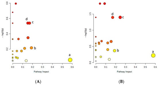 Comparison of the results of the metabolic pathway for the lemon leaves obtained as a function of the substrate (A) and the rootstock (B) where, in both cases, node (a) represents the metabolism of alanine, aspartate and glutamate; (b) the pathway of the citrate cycle (TCA cycle or Krebs cycle); (c) the biosynthesis of arginine; and (d) the metabolism of arginine and proline.