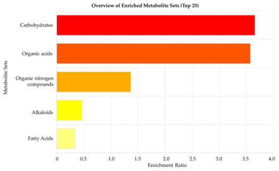 Finally, the results obtained were confirmed through the enrichment analysis calculated by the relationship between the compounds detected and those expected based on the metabolic pathways/nodes identified regardless of the variable considered. The high enrichment ratio (>3.5) for carbohydrates and organic acids confirms the suitability of the routes evaluated (Figure 7).