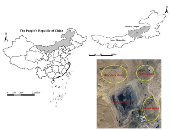 Coal resources have always been in the main position in global energy, and the degree of global mining of coal resources has been gradually increasing in recent years []. The total global coal production in 2019 was 8.129 billion t, up 0.50% compared with 2018 []. China is the largest coal producer and consumer in the world, accounting for 47.30% of the total global coal production in 2019 []. Open-pit coal mining is the main mining method in the world, and the proportion of open-pit coal mining in several other major coal mining countries (USA, Russia, India, etc.) except China is basically above 50%. Some countries reach more than 90%, and the proportion of open-pit coal mining in China has also increased from 4% to 15% [,]. While the large-scale mining of open-pit coal mines meets the needs of China’s economic construction, it also causes many ecological and social problems [,,]. China’s National 12th Five-Year Plan states that it will promote the development of diversified and clean energy sources, vigorously develop a circular economy, enable the effective reduction and resource utilization of solid waste from industrial and mining enterprises, reduce and control pollutant emissions, reduce resource waste, increase the proportion of non-fossil energy consumption in primary energy, and create an environmentally friendly and resource-saving society [].