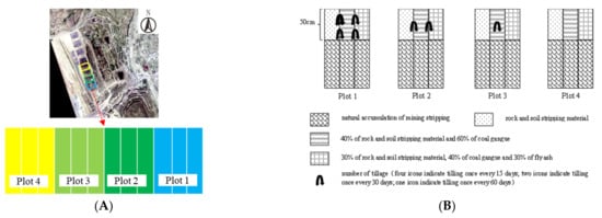 Sample plots were surveyed and sampled (ring knife method) in August 2019 for four large fields and un-reclaimed land in the reclaimed area of the inner dump after reclamation that year (located in the northern part of the test field for this sampling, which consisted mainly of rock and soil stripping material from mining and was used as a control sample plot). The maturation treatments for the four large plots were as follows: Plot 1 was tilled once every 15 days, tilled for one year and planted with Medicago sativa L. and at the end of the year the Medicago sativa L. was tilled into the soil and replanted with Medicago sativa L. for one year. Plot 2 was tilled once every 30 days, tilled for one year and planted with Medicago sativa L. and at the end of the year the Medicago sativa L. was tilled into the soil and replanted with Medicago sativa L. for one year. Plot 3 was tilled once every 60 days, tilled for one year and planted with Medicago sativa L. and at the end of the year the Medicago sativa L. was tilled to the soil and replanted with Medicago sativa L. for one year. Plot 4 was tilled and planted with Medicago sativa L. in the same year, and at the end of the year, the Medicago sativa L. was tilled to the soil and replanted with Medicago sativa L. for one year. The sample area at the time of sampling was one year after the tillage treatment and planted with Medicago sativa L. and the Medicago sativa L. had grown out by then. The vertical sections of the soil reconstruction program and the maturation treatment for the four large plots are shown in the figure below. In order to make the selected points in the sample plots represent different levels of vegetation recovery, a qualitative grading of vegetation growth was carried out in the sampled plots, and the actual qualitative grading was carried out in three different reconstructed plots, considering the variability of the overall level of vegetation recovery in different reconstructed plots. In each small field plot, 12 sample points were set on the representative plots based on the line transect method, and the vegetation restoration level was defined as 1, 2, 3, and 4 grades from excellent to poor according to the vegetation growth, and 3 soil sample points were set under each grade with a sampling depth of 20 cm, and the soil samples collected from the 3 sample points were mixed. The plan view of the study area is shown in Figure 2A, where each small field block has an area of approximately 15,180 m2. The vertical section of soil reconstruction scheme and maturation treatments of field is shown in Figure 2B.