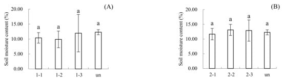 When the vegetation growth grade is 2, the difference of soil moisture content under different soil reconstruction methods is shown in Figure 4. When tilled once in 15 days, the soil moisture content of un-reclaimed land was the highest at 12.29%, followed by reclaimed land 1-3 at 11.97%, with no significant difference among the plots (Figure 4A). When tilled once in 30 days, the soil moisture content of reclaimed land 2-2 was the highest at 13.12%, followed by reclaimed land 2-3 at 12.90%, with no significant difference among the plots (Figure 4B). When tilled once in 60 days, the soil moisture content of un-reclaimed land was the highest, and there was no significant difference among the plots (Figure 4C). The soil moisture content of the un-reclaimed land was the highest when planted Medicago sativa L. in the same year after tillage treatment, which was significantly higher than that of the reclaimed land 4-2, with a percentage of 38.48%; there was no significant difference between the un-reclaimed land and the reclaimed land 4-1 and 4-3 (Figure 4D).