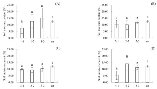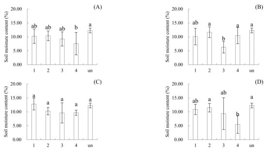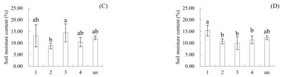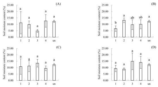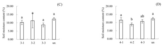 Difference in soil moisture content under different ripening treatment methods when the soil reconstruction method is rock and soil stripping material. (A) vegetation growth grade 1, (B) vegetation growth grade 2, (C) vegetation growth grade 3, and (D) vegetation growth grade 4. Different letters indicate significant difference.