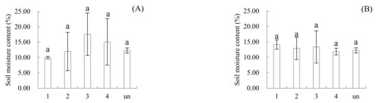 When the soil reconstruction method is rock and soil stripping material, the variability of soil moisture content of reconstructed soil under different tillage number is shown in Figure 10. When the vegetation growth grade was 1, 2 and 3, there was no significant difference in the soil moisture content under different tillage number, and the soil moisture content of the reconstructed soil is mostly lower than that of the un-reclaimed land (Figure 10A,B,C). When the vegetation growth grade was 4, the soil moisture content of the un-reclaimed land was the highest at 12.29%, followed by the large field block 2, which soil moisture content was 10.47%, both of which were significantly higher than that of large field block 4, with higher proportions of 125.22% and 91.81%, respectively (Figure 10D).
