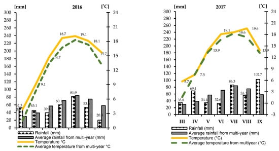In the years of the study, a varied sum of rainfall was recorded during the growing season of soybean. The highest total rainfall was recorded in 2017 and 2018 and exceeded 35% that in 2019 and was 30% less than the long-term average (Figure 1). In 2016 a lower air temperature was recorded in the third decade of April, compared to the long-term average, which had a significant impact on the emergence, growth and development of soybean crop, especially those sown in the second date. A small amount of rainfall was recorded in the third decade of May and the first decade of June, which had an unfavorable effect on the development of soybean crop. A small amount of rainfall in the second decade of August resulted in the accelerated plant maturation, regardless of the sowing date. In 2017 there was a strong cooling at the end of the second decade of April, and frosts occurred at night, which caused a delay in sowing soybeans on the first date (sowing was carried out on 25 of April). At the beginning of the third decade of April and the first decade of May, the high amount of rainfall was noted (exceeded the long-term average by 77%), which made it difficult to make the mechanical treatment in the field of soybean crop. In June and the first decade of July, a small amount of rainfall compared with the multi-year average was recorded, which had a negative effect on the growth and development of soybean plants. Very little rainfall was also recorded in the first decade of August (0.9 mm), which caused premature soybean maturity. In 2018, the amount of rainfall in May and July exceeded the average from multi-years by 70.9 and 41.1%, respectively, which favored the yields of soybean. In the last year of the study (2019), little rainfall was recorded in the first and second decade of April and at the beginning of the first decade of May. Moreover, in the first and second decade of June, in July and in the first decade of August, drought occurred, which limited the growth and development of soybean. In August, in the second decade, significant rainfall was recorded, which contributed to the prolongation of the vegetation period, delayed maturation of soybean plants, and the occurrence of weed infestation, especially with Chenopodium album L. Moreover, in all years of the study, in July and August, high air temperatures were recorded, which additionally worsened conditions for crop yields.