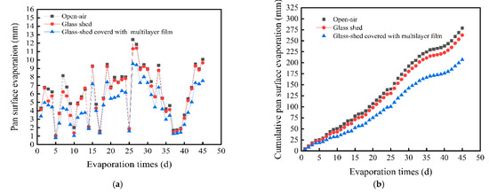 The imbalance between precipitation and water evaporation has caused crop yield reduction, drought, and desertification. Furthermore, most parts of the world are short of water, including China. We proposed a low-cost polymer multilayer film to reduce water evaporation by only passing through several sunlight wavelengths necessary for photosynthesis. A series of experiments were conducted to characterize the influence of partial sunlight on the reduction of water evaporation. Evaporation containers and evaporation pans were placed in open-air (CK), under a glass shed (GS), and under a glass-shed covered with multilayer films (GMF). Our results showed a significant reduction in water evaporation under GMF. Cumulative soil surface evaporation of CK, GS and GMF over 45 days was 80.53 mm, 68.12 mm, and 56.79 mm, respectively. Under GMF, cumulative water evaporation from soil and pan surfaces decreased by 29% and 26%. The slope ( of simple linear regression showed a significant relationship between evaporation time and cumulative water evaporation (p = 0.000 < α = 0.05 shown in the ANOVA table). The correlation coefficient was more than 0.91 in all treatments, suggesting a strong positive linear relationship. This study may contribute to future drought resistance and agrivoltaic sustainability development.