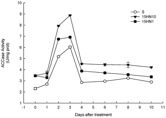 ACCase activities in the R and S populations changed similarly from 0 d to 10 d (Figure 1). The results showed that ACCase activities in both the R and S populations increased significantly at 1 d and peaked at 3 d. The activity in both the R (15HN10, 15HN1) and S populations declined at 3 d after treatment with haloxyfop-P-methyl and afterward tended to remain stable. However, ACCase activities in the two R populations were significantly higher than that of S populations during the whole experiment.