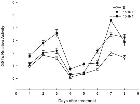 GST activity was analyzed over a period of 9 d (Figure 2). After haloxyfop-P-methyl treatment, the GST relative activity of the R (15HN10, 15HN1) and S populations increased and peaked first at 3 d and 2 d, then fell to the bottom at 4 d. A second peak was found at 7 d. The trend of GSTs in the three populations was basically the same. GST relative activity in the R populations was consistently greater than that in the S population.