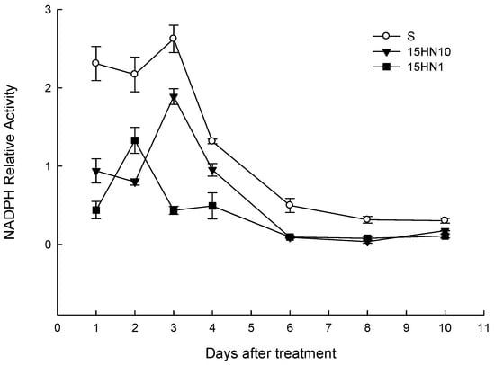 NADPH relative activity was analyzed during a period of 10 d (Figure 3). After haloxyfop-P-methyl treatment, the NADPH relative activity of the 15HN10, 15HN1 and S populations increased and peaked at 3 d, 2 d and 3 d, respectively. Variation tendency in all the R and S populations changed similarly from 4 d to 10 d, while the activity in the S population was consistently greater than that in the R populations. The results indicated that there was no direct correlation between NADPH and metabolic resistance to haloxyfop-P-methyl in D. sanguinalis.