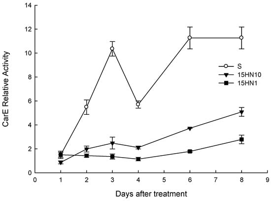 CarE relative activity was analyzed during a period of 8 d (Figure 4). After haloxyfop-P-methyl treatment, the CarE relative activity in the S population rapidly increased and peaked at 3 d, while that in the two R populations (15HN10, 15HN1) increased slowly and peaked at 8 d. The CarE relative activity in the S population was consistently significantly greater than that in the R populations, which means that less haloxyfop acid and less phytotoxicity may be present in the resistant tissues compared to the susceptible ones. Therefore, the R populations can survive more than S ones at the same applied herbicide doses, showing haloxyfop-P-methyl resistance in resistant D. sanguinalis populations.