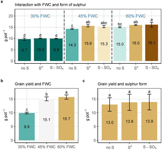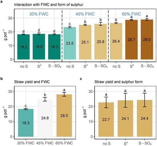 Under both optimal water conditions (60% FWC) and moderate water stress, the grain yields of wheat grown without sulphur application were not significantly different (Figure 1a). Applying elemental sulphur caused an increase in grain yield under moderate stress, whereas sulphate was more effective in wheat grown under adequate water supply (Figure 1a). Sulphur application (Figure 2a)—both elemental and sulphate—significantly improved the yield of wheat straw grown under optimal water conditions and moderate stress, but observed increases did not exceed 10% in comparison to plants grown without sulphur. The severe water stress significantly lowered the yield of grain and straw, regardless of sulphur fertilisation (Figure 1a,b and Figure 2a,b). Under this condition, wheat biomass production (grain, straw) was greatly reduced (Figure 1a,b and Figure 2a,b), but not by more than 40% in comparison to well-watered plants (60% FWC).