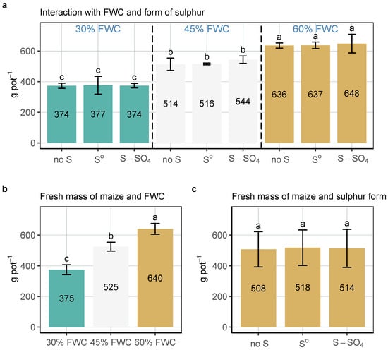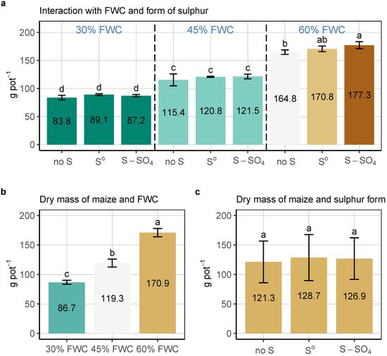 Our results show that the growth of both wheat and maize markedly dropped under drought conditions (Figure 1a,b, Figure 2a,b, Figure 3a,b and Figure 4a,b), and wheat reacted better than maize to sulphur fertilisation under optimal conditions (60% FWC) and moderate water stress (45% FWC) (Figure 2a).