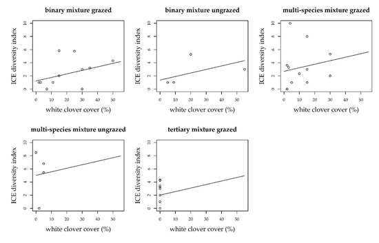 The grass-clover mixtures did not differ in regard to wild bee abundance (Table A2); although, the abundance of wild bees increased significantly with the flower cover of white clover (p < 0.001) in all three grass-clover mixtures and across all management types (Figure 1). There was a significant trend of an increase in the ICE diversity index with flower cover of white clover in all three mixtures and under all managements (p = 0.062, Figure 2), but, again, the mixtures did not differ in terms of wild bee diversity (Table A3). Although we did not find an effect of mixture on the ICE diversity index, we found 2.1% of the rare long-tongued bumblebee species on the grazed pastures of the binary mixture, 1.7% long-tongued bumblebees on the tertiary mixture and 10.3% long-tongued species on the multispecies mixture, thus indicating more long-tongued species in the mixture with most plant species.