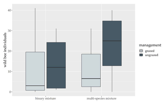 Numbers of wild bee individuals on grazed pastures and ungrazed strips (management) of the binary mixture and multispecies mixture.