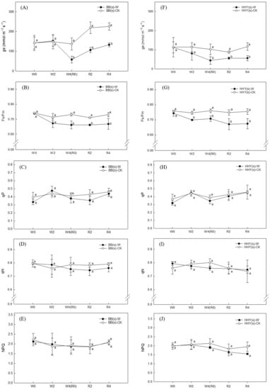 The stomatal conductance (gs) and chlorophyll fluorescence parameters of two cultivar own-rooted seedlings during waterlogging (W0, W2, and W4) and the post-waterlogging recovery period (R0, R2, and R4). (A–E) Performance of cultivar ‘Black-Beauty’ (BB). (F–J) Performance of cultivar ‘Hung-Hsin-Yuan’ (HHY). Bars indicate the standard deviation of three replicates, and different letters represent the significant difference between the treatments on the same investigated day.
