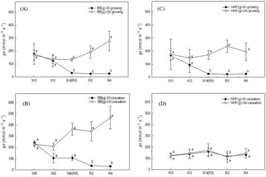The stomatal conductance (gs) of grafted seedlings of ‘Black-Beauty’ (BB) (A,B) and ‘Hung-Hsin-Yuan’ (HHY) (C,D) treated with waterlogging (W0, W2, and W4) during the growth period or the growth cessation and continuously investigating the post-waterlogging recovery period (R0, R2, and R4). Bars indicate the standard deviation of three replicates, and the different letters represent the significant difference between the treatments on the same investigated day.