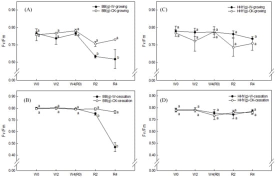 We also detected differences between the two cultivars with respect to Fv/Fm. The Fv/Fm of grafted BB seedlings showed a sustained decline during the growth period as long as the waterlogging started, but the significant decline was shown at the W4 (R0) stage during the growth cessation (Figure 3A,B). The post-waterlogging reduction in Fv/Fm during the growth cessation was found to be 39% relative to that of the control group, which was higher than the 15% reduction during the growth period. Contrastingly, the grafted HHY seedlings, during both the growth or growth cessation periods, showed no significant differences in Fv/Fm relative to the control group during either the waterlogging or post-waterlogging periods (Figure 3C,D). However, the slight variation during the whole evaluation period indicated that the effects of waterlogging on Fv/Fm of grafted HHY seedlings were weak in response to waterlogging stress, especially during the growth cessation period.