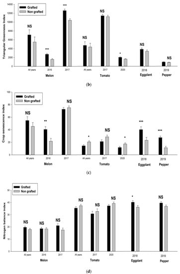 | Parameters | p Value Treatments (Grafted, Non-Grafted) | p Value Interaction (Crop * Treatments) | |