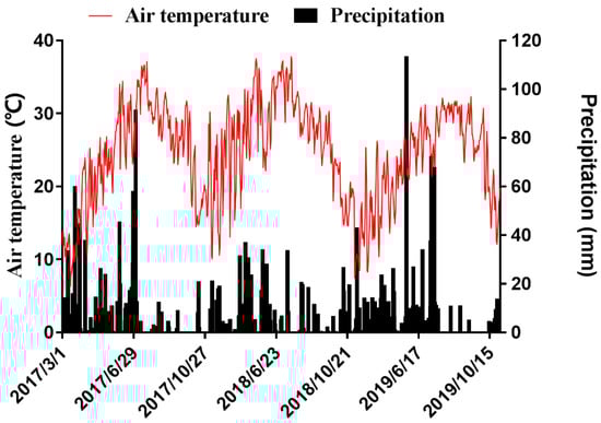 In 2017 to 2019, a field trial was established in Santang County, Hunan Province, China (112°29′ E; 26°52′ N), and a microplot test with different fertilization gradients was established in the same plot in 2020. Before the test set-up, 20 cm depth soil samples were collected from the cultivated layer, and the physicochemical properties were determined: total N using the Kjeldahl N method; available N using alkaline hydrolysis diffusion; available P using colorimetry following extraction with 0.5 mol L−1 NaHCO3 (pH = 8.5); available K by flame photometry following extraction with 1 mol L−1 CH3COONH4 (pH = 7.0); pH by the use of deionized water to remove CO2 (1:1 soil/water, w/v); soil organic matter was determined by the potassium dichromate external heating method. The soil texture was clay loam with total N of 1.69 g kg−1; available N of 122.38 mg kg−1; available P of 21.46 mg kg−1; available K of 211.82 mg kg−1; pH of 5.62; organic matter of 31.44 g kg−1. The growth period of ESR was from April to July and that of LSR was from July to November. The ESR cultivars were Zhuliangyou819 (ZLY819) and Zhongjiazao17 (ZJZ17), and the LSR cultivars were Taiyou390 (TY390) and Xiangwanxian13 (XWX13). The rice cultivars of this experiment were provided by the State Key Laboratory of Hybrid Rice, Hunan Agricultural University. Climatic data for daily air temperature (°C) and precipitation (mm) in each experimental site were obtained from a local meteorological bureau (Figure 1).