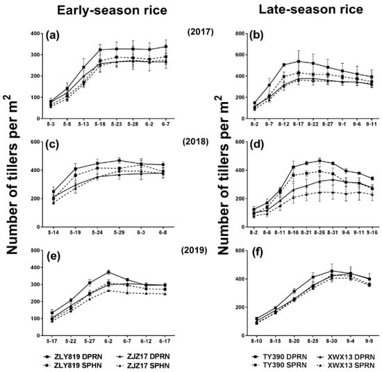 Tiller dynamic of double-cropped rice under different treatments from 2017 to 2019. DPRN represents dense planting with a reduced nitrogen rate; SPHN represents sparse planting with a high nitrogen rate; (a) represents early–season rice in 2017; (b) represents late–season rice in 2017; (c) represents early−season rice in 2018; (d) represents late−season rice in 2018; (e) represents early−season rice in 2019; (f) represents late−season rice in 2019.