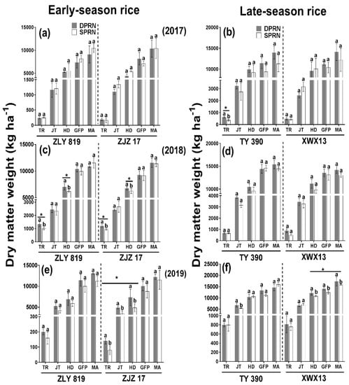 Dry matter weight of double-cropped rice under different treatments from 2017 to 2019. Data points represent treatment means (n = 3), and different letters indicate significant differences (* p < 0.05). DPRN represents dense planting with a reduced nitrogen rate; SPHN represents sparse planting with a high nitrogen rate. ZLY 819 (hybrid rice) and ZJZ17 (conventional rice) belong to early-season rice cultivars; TY 390 (hybrid rice) and XWX 13 (conventional rice) belong to late-season rice cultivars. TR represents the tillering stage; JT represents the jointing stage; HD represents the heading stage; GFP represents the grain-filling period; MA represents the maturity stage; (a) represents early−season rice in 2017; (b) represents late−season rice in 2017; (c) represents early−season rice in 2018; (d) represents late−season rice in 2018; (e) represents early−season rice in 2019; (f) represents late−season rice in 2019.