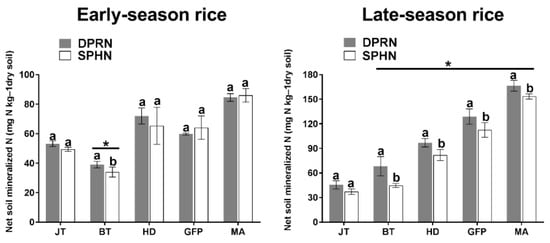 Net soil mineralized nitrogen cultured for two weeks at different stages of double cropping rice under different treatments. Data points represent treatment means (n = 3), and different letters indicate significant differences (* p < 0.05). DPRN represents dense planting with a reduced nitrogen rate; SPHN represents sparse planting with a high nitrogen rate; JT represents the jointing stage; BT represent the booting stage; HD represents the heading stage; GFP represents the grain-filling period; MA represents the maturity stage.