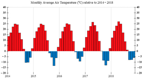 The degree-days method, which is the most efficient way to determine the heat transfer in the envelope, is used to calculate the degree-days in CSG. In northeast of China, CSGs are used as the main horticultural structure to provide the environment for overwinter plants [19]. There are no cooling systems inside the CSG, so the cooling degree-days was zero. The heating degree-days (HDD) is calculated to be the sum of difference between the outside temperature (Tout) and the inside setting temperature (Tset). Tout is calculated by the mean monthly temperature from the meteorological data based on China Meteorological Agency in Shenyang regions (Latitude, 123°23′, Longitude, 41°48′). The inside temperature (Tset) is set at 15 °C for heating at night [25,26]. When the inside temperature is below 15 °C, the heating system works.