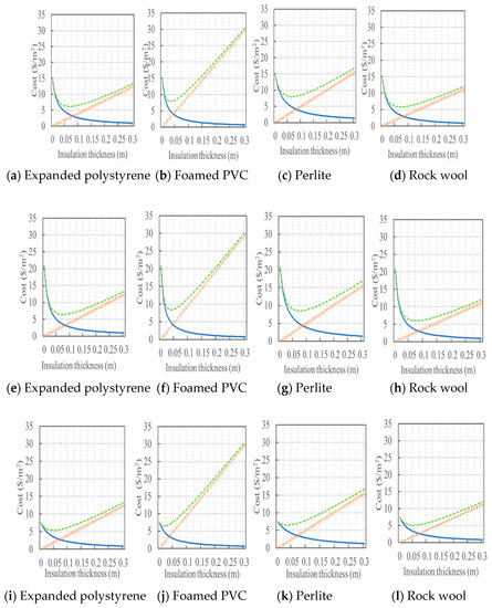 Effect of thickness of insulating materials on the total cost for three typical walls. (a–d) For the clay brick wall, (e–h) for the hollow concrete block wall, and (i–l) for the fly ash block wall.