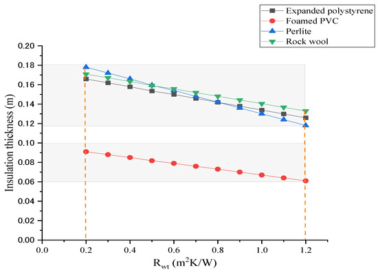 Figure 7 illustrates the effect of thermal resistance of the composite wall on the optimum insulation thickness. The optimum insulation thickness will decrease linearly with the increase in Rwt. For the insulating material of expanded polystyrene, perlite, and rock wool, the optimum simulation thickness was in the range of 0.1–0.2 m and was 0.05–0.1 m for that in the insulation of foamed PVC, with the Rwt of 0.2–1.2 m2K/W. According to the result, the optimum insulation thickness can be proposed in Shenyang for these representative materials.