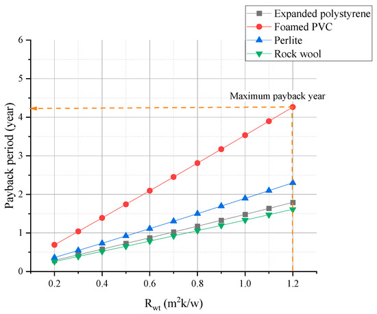 The effect of Rwt on the payback period for different insulating materials at the optimum thickness.