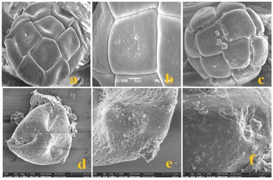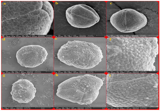 The first sample was collected from Wanning. The pollen was shed as tetrad polyads, the shape was tetrahedral, the symmetry was bilateral and the polarity was heteropolar. The aperture condition was noted as inaperturate. The uniplanar tetrad with the proximal sides of two individual units is directly connected, while the other two units are separated. The exine sculpturing was predominantly areolate and psilate, with various sized verrucae having an isodiametric shape (Figure 1h,i, Figure 2a–c). The pollen size was noted as 7.8 × 7.75 µm. The individual grain diameter was 3.85 µm and the diameter of each verruca was 0.64 µm. In comparison with previous studies, the exine sculpturing was characterized by tubercles that were inconsistent with our results, except for the tetrads type of pollen noted by Agashe and Caulton [59]. Inaperturate tetrahedral- and tetrad-type pollen with an average diameter of 9 µm in M. pudica samples in Singapore has also been reported previously [62].