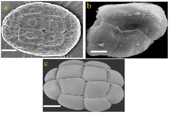 The pollen was shed in polyads (12 grains), the outline in the polar view was rhomboidal, the symmetry was bilateral and the polarity was heteropolar. The aperture condition was noted as inaperturate. Exine sculpturing was found as mega-reticulate and rarely scabrate. The reticula were thick and flattened, having a rarely scabrate structure, while the lumina was filled with a somewhat micro-scabrate structure (Figure 1a–c). The pollen size was noted as 23.19 × 13.88 µm, while the individual grain diameter was 5.745 µm.