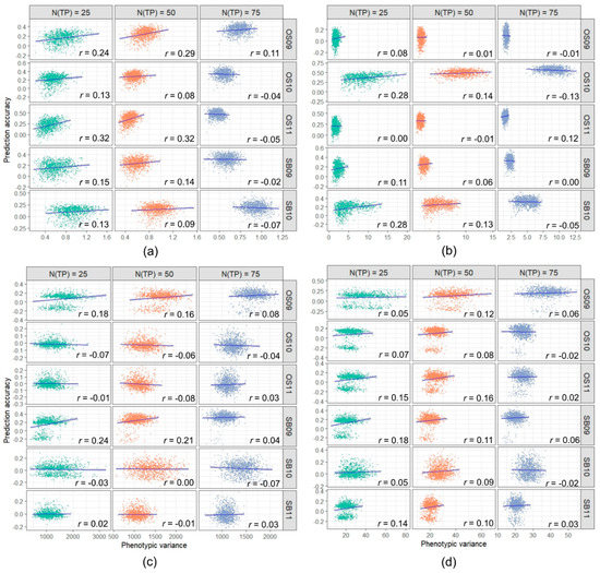 Phenotypic variance of randomly selected TP plotted against prediction accuracy values obtained using RR-BLUP model. The top two scatter plots refer to observations for (a) GPC and (b) TW traits of BK population, and the bottom two to (c) MTI and (d) MPH traits of MG population. For each population–trait–environment combination, three different sizes of TP were used (25, 50, and 75 lines) with remaining lines serving as VP.
