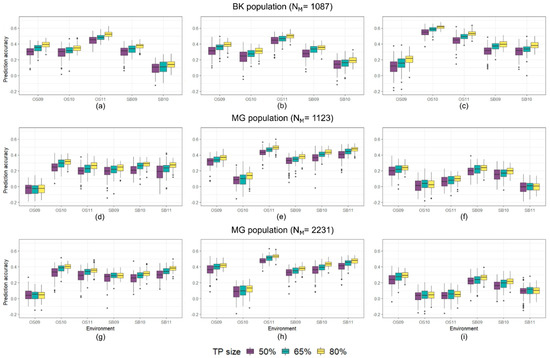 Prediction accuracy values obtained using RR-BLUP model and three different sizes of TP (50%, 65%, and 80% of the total number of lines in a population). The top three boxplots represent results obtained for BK population and traits (a) GPC, (b) WGC, and (c) TW. The middle three boxplots refer to observations for MG population and traits (d) MPT, (e) MTW, and (f) MPH in the case when half of the marker dataset was used (NM = 1123 SNPs), while the bottom three (g–i) refer to the same traits, respectively, but using the whole available marker dataset (NM = 2231 SNPs).