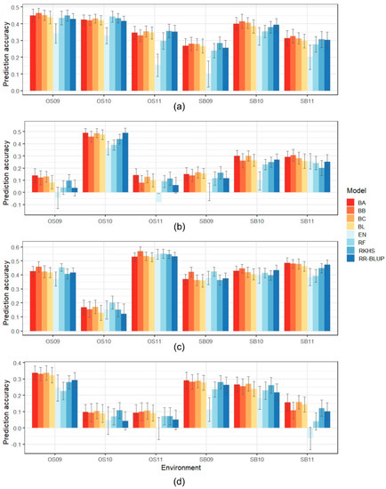 Figure 3 shows the mean prediction accuracy for the MG population and the traits (a) GPC, (b) TW, (c) MTW, and (d) MPH obtained with eight different prediction models. Results for the remaining three traits (WGC, MPT, and MTI) are shown in Figure S6 in the Supplementary Materials. In both Figure 3 and Figure S6, the error bars indicate the standard deviation. The mean prediction accuracies over 100 independent 10-fold cross-validations are shown along with the standard deviations in Table S2 in the Supplementary Materials. The highest prediction accuracy achieved for each trait–environment combination is shown in bold. The mean MSEP values for all trait–environment–model combinations are listed in Table S3 in the Supplementary Materials. In general, trait predictability was found to be good in some environments while being low in other environments. For example, the prediction accuracy of TW (Figure 3b) was low (−0.08–0.31) in all environments except environment OS10, where the prediction accuracy was moderate (0.36–0.49) for all models examined, whereas the prediction accuracy of WGC (Figure S6a in the Supplementary Materials) was moderate for most environment–model combinations except environment SB09, where the prediction accuracy was low and even negative for the model EN. However, overall, GPC, WGC, and two mixograph traits (MPT and MTW) showed moderate predictability with prediction accuracies up to 0.57 (Figure 3a,c and Figure S6a,b and Table S2 in the Supplementary Materials). The predictability of TW and the other two mixograph traits (MTI and MPH) was rather low and varied substantially between environments, resulting in negative values of prediction accuracy in some cases (Figure 3b,d and Figure S6c and Table S2 in the Supplementary Materials). When comparing the performance of the different models, it is noticeable that the model with best performance depends strongly on the observed environment and not so much on the trait. According to Table S2, the model EN had the lowest values of prediction accuracy for the most combinations of traits and environments and was also the model with the highest number of cases with negative prediction accuracy values. In only one case did the EN model achieve the highest prediction accuracy (MPT trait in environment SB10). In 35 of 42 possible trait–environment combinations, the Bayesian alphabet models (BA, BB, and BB) proved to be superior, whereas the BL model performed best in only two cases, followed by the RF model with five and the RKHS model with seven cases. Although the RR-BLUP model performance was superior in only one case (TW trait in OS10 environment), the performance of all other models was not substantially better compared to it. Indeed, the prediction accuracy of the best performing model was on average only 0.05 points higher and ranged from 0 (in the case of the TW trait in the OS10 environment where the BA and BC models had the same prediction accuracy as RR-BLUP) to 0.14 (in the case of the MPT trait in the OS09 environment, where the superior model was BB with a prediction accuracy of 0.18 compared to 0.04 of the RR-BLUP model). Observed MSEP values (Table S3 in the Supplementary Materials) were relatively low (0.44 or lower) for the majority of the trait–environment combinations with little or no difference among prediction models used. The highest MSEP values were recorded for MTI, ranging from 0.49 to 3.42. One of the biggest differences among the implemented models is their computational efficiency, i.e., the time required for one analysis. In the present study, conducted on a 64-bit Windows 10 workstation with a 2.90 GHz Intel (R) Xeon (R) processor and 32 GB RAM, the least demanding model was EN, which took approximately 19 min to compute a prediction accuracy. It was followed by RR-BLUP, RF, and RKHS with computation times of 38, 71, and 92 min, respectively. The most demanding were the Bayesian models, which required almost 3 h to compute an analysis (166, 162, 161, and 171 for BA, BB, BC, and BL, respectively).