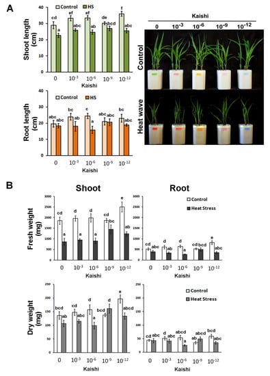 To determine possible molecular targets of the product action, we employed a hydroponic experiment with strictly controlled growth parameters using the highest Kaishi dilution (10−12). The imposed heat shock resulted in statistically significant changes in the monitored growth parameters, evident by the shorter shoots and roots, and the decreased dry weight of the organs (Figure 5). The application of the biostimulant at 10−12 dilution had a stress-mitigating effect manifested by the relatively unaffected organ growth, and the higher FW and DW of the pre-treated and subsequently heat-stressed plants, as compared to the stressed individuals, which did not receive biostimulant priming.