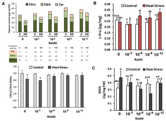 Photosynthetic pigments (A), free L-Pro content (B), and MDA (C) in soil-grown maize plants subjected to heat waves with or without biostimulant treatment (application via foliar spray of 10−3, 10−6, 10−9, and 10−12 Kaishi solution). Values are means of three biological repeats (n = 3) ± SD. Different lowercase letters (multifactor ANOVA) and asterisks (one-way ANOVA) indicate statistically significant differences at p < 0.05.
