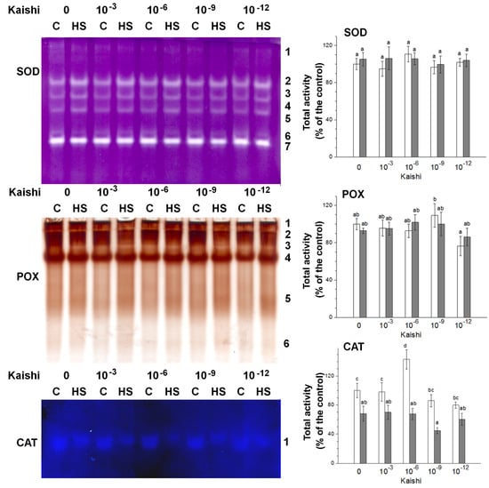 Secondary oxidative stress usually develops under prolonged or severe primary stresses, including heat waves. The increased ROS production is counteracted by different detoxifying enzymes, such as SOD, CAT, and various POX enzymes. Seven SOD isoforms, six POX, and one CAT isoform were detected via in-gel staining in the leaf samples (Figure 3). Under heat stress, an increase in the total SOD activity was observed, while the total POX activity remained unchanged. CAT activity diminished in the samples derived from the heat-stressed individuals. In the Kaishi-treated plants, a slight increase in SOD and CAT activities was observed with the 10−6 dilution, while POX activity tended to be stimulated with the 10−9 dilution. The heat stress slightly induced further POX activity in the biostimulant-treated plants with the 10−6 dilution. The SOD activity marked its highest levels in the samples pre-treated with the 10−3 dilution. The applied stress reduced CAT activity with the 10−9 dilution.