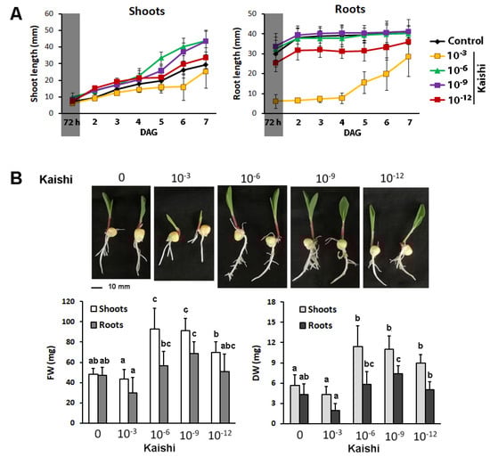 Effects of different amounts of the biostimulant on plant germination and growth in hydroponic cultures. (A) Germination for 72 h in darkness (reflected by a shaded sector on the graph) and organ growth on Kaishi containing media; (B) phenotype, fresh weight (FW), and dry weight (DW) of shoots and roots of 7-day-old plants on Kaishi containing media. The different lowercase letters designate statistically significant differences at p ˂ 0.05, and the error bars represent SD (n ≥ 20, multifactor ANOVA).