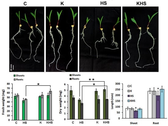 Phenotype and growth parameters (organ length, FW, and DW) of 11-day-old hydroponically grown maize plants, 48 h after the applied heat shock (1 h at 45 °C). C, control; HS, heat shock; K, treated with Kaishi (dilution 10−12) and grown under normal conditions; KHS, treated with Kaishi (dilution 10−12) and subjected to heat shock 24 h later. Asterisks designate statistically significant differences at p < 0.05 (*) and p < 0.01 (**). The error bars represent SD (n ≥ 15, one-way ANOVA).