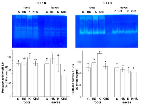 In-gel staining of acidic (pH 5.0) and neutral (pH 7.5) protease activity. Protein loading on each lane equals 25 µg of total soluble protein for the root samples and 50 µg of total soluble protein for the leaf samples. The graphs represent mean values of three separate measurements of the staining intensity performed with ImageJ (n = 3 ± SE). The results are expressed as % of the control. Different letters above the columns indicate significant differences at p < 0.05 (multifactor ANOVA).