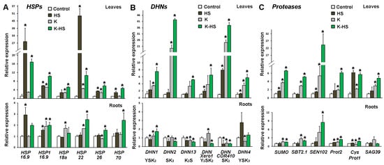 Transcript profiling of genes coding for heat shock proteins (HSPs) (A), dehydrins (DHNs) (B), and proteases (C) in leaves and roots of control and heat-stressed plants (HS) which were not treated with biostimulant; plants which received Kaishi (10−12) and were grown under normal conditions (K) or subjected to heat shock 24 h later (K-HS). Values are means of three biological repeats (n = 3) ± SD, and the asterisks designate statistical significance compared to the control sample at p < 0.05, (one-way ANOVA).