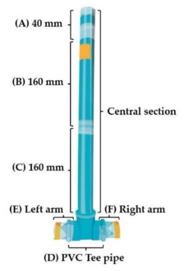 Schematic representation of a modified T-shaped olfactometer. (A) 40 mm PVC piece, (B) and (C) 160 mm length pieces, (D) PVC Tee pipe, and (E,F) left and right arms (40 mm length PVC).