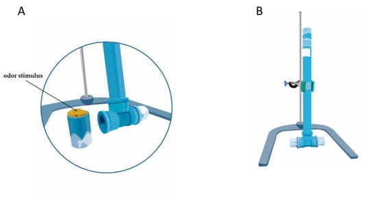 Modified T-shaped olfactometer. (A) Arm containing the odor stimulus and (B) universal support where the olfactometer was attached during the assays.