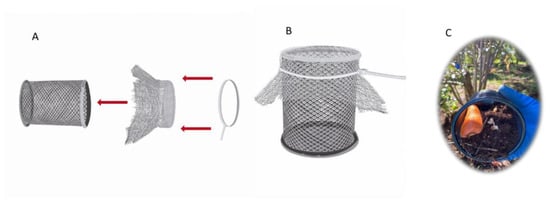 In this study, we sought to determine the effect of the selection process using VOCs on the efficacy of S. australe against A. superciliosus larvae. For this purpose, we compared the larval mortality obtained by the selected IJs, IJs from the original stock, and the control without EPNs on 3 years of blueberry plants var. Duke. These plants were contained in 35 L pots (40 cm diameter and 36 cm deep). Each pot containing one plant was suitably watered every two days and maintained at 15 °C previous to the assay. The soil contained in the pots was autoclaved to avoid the previous presence of EPNs. Ten A. nodipennis 5th instar (40 mg) larvae were introduced per plant, separated into two groups of three larvae and one of four larvae. Each group of larvae was introduced into a metallic jar with holes (Figure 3A,B), each containing autoclaved soil and a chunk of carrot for food (Figure 3C). The use of these metallic jars was necessary to avoid the escape of the larvae (observation made during previous assays) and to keep the larvae at different depths between 0 and 30 cm. The dose of nematodes applied was 290.000 IJs/pot diluted in 1 L of tap water. The IJ solution was gently poured into the pot with a watering can. All pots were maintained at 75% RH, and 14:10 L:D. Larval mortality was observed 72 h after inoculation of IJs, and nematode virulence (efficacy) was measured as the percentage of dead larvae per treatment. Cadavers showing typical EPN infection symptoms (i.e., brownish color and floppy texture) were separated and thoroughly rinsed in distilled water to remove adhering IJs. Each cadaver was individually placed into a 5 cm Petri dish with 9 mL of pepsin and opened with a scalpel to determine the number of IJs that penetrated the larva 72 h after IJ application [,]. Larvae with IJs inside were considered successfully infected by S. australe. The number of IJs that penetrated each larva was determined. The greenhouse trial was arranged in a completely randomized design with eighteen replicates per treatment. Independent trials were conducted at 16 and 25 °C.