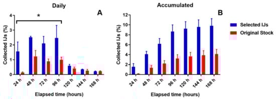 For selected IJs, a larger proportion (number of IJs collected/number of IJs inoculated) of recovered IJs was observed during the first four days of collection from the T-shaped modified olfactometers (Figure 3A) when compared with the remaining time. The advantage taken by the selected IJs during the first four days post-application was unattainable for the IJs from the original stock. Even when the difference narrowed as the days went by, it was confirmed that selected IJs were faster to reach the stimulus than IJs from the original stock (Figure 3B).