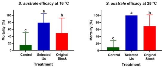 The results from the greenhouse trial revealed that the efficacy of S. australe selected IJs against A. nodipennis was significantly higher than that for IJs from the original stock at 16 °C (one-way ANOVA; F2,51 = 14.6; p ≤ 0.0001) and 25 °C (one-way ANOVA; F2,51 = 81.6; p ≤ 0.0001). Selected IJs reached 100% mortality at 25 °C and 79% at 16 °C, compared to the original stock (Figure 5), where IJs showed 70% of larval mortality at 25 °C and 49% at 16 °C. For both temperatures, control mortality did not exceed 15%.