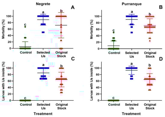 In the field, selected IJs showed higher efficacy than IJs from the original stock in both blueberry (one-way ANOVA; F2,8 = 3.9; p≤0.0001; Figure 6A) and sarsaparilla (one-way ANOVA; F2,87 = 166.6; p ≤ 0.0001; Figure 6B) orchards. In both localities, selected IJs reached approximately 90% of S. australe larvae mortality, showing almost 20% more efficacy than treatments evaluated with IJs from the original stock (70% approximately). In both localities, larvae from the control resulted in less than 9% mortality.