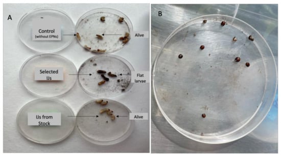 A. superciliosus larvae cadavers. (A) Larvae treated without EPN, with the selected IJs and IJs from the stock and (B) cephalic capsules obtained after 96 h of treatment of the larvae with the selected IJs.