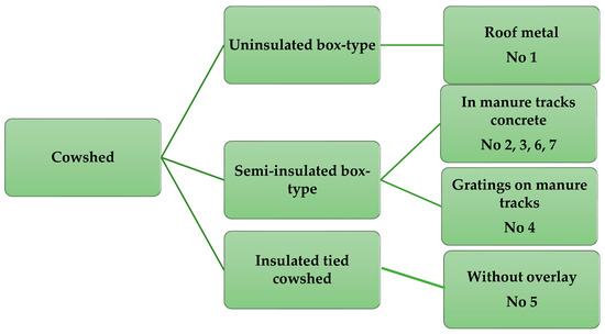 In the selected cowsheds, the cows are kept in the barn all year round. All cowsheds are boxed, with different barn wall and roof constructions, their insulation, manure removal systems, and microclimate formation systems. The cowsheds are equipped with slit ventilation systems, cowsheds 1 and 5 do not have fans to intensify the movement of air, other cowsheds are equipped with fans, and cowshed 7 is additionally equipped with air humidification—an air-cooling system.
