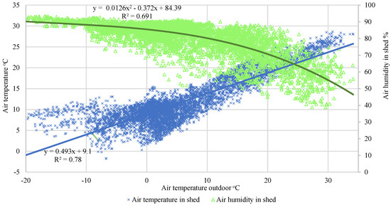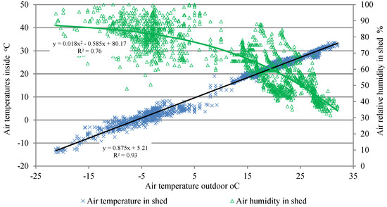 Figure 3. Air temperatures and relative humidity dynamics in uninsulated cowshed box-type (1 cowshed) related to outdoor temperatures.